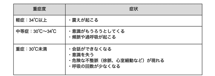 低体温症の重症度およびそれに伴う症状は以下のとおりです。