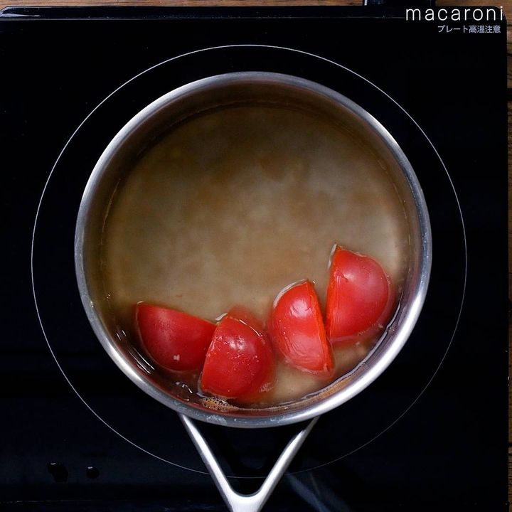 2: 鍋に水を沸騰させ、トマト、鶏ガラスープの素、 しょうがを加えて煮込みます。