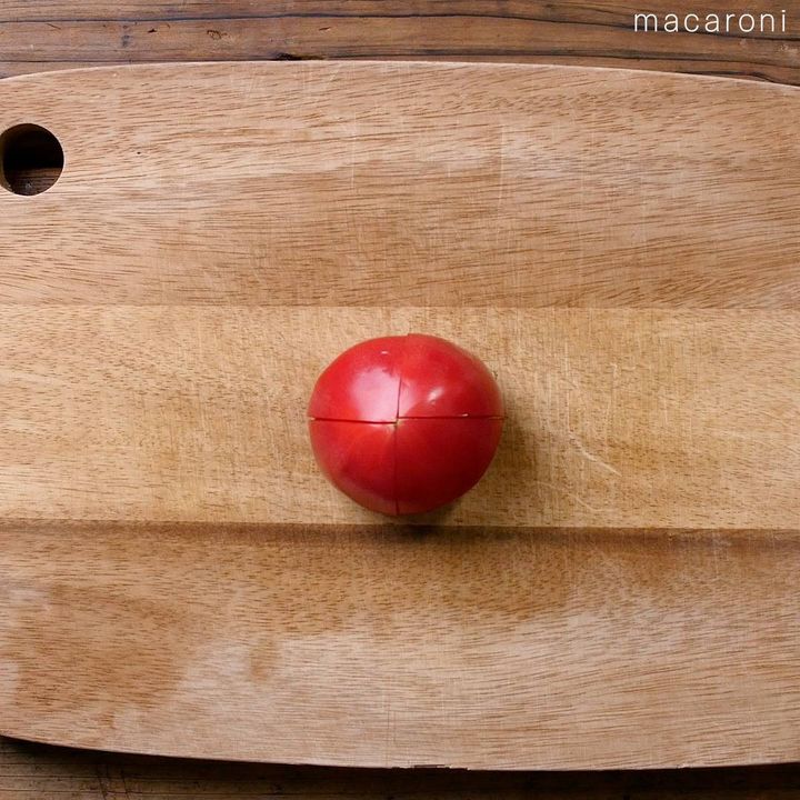 1: トマトは縦に4等分に切ります。