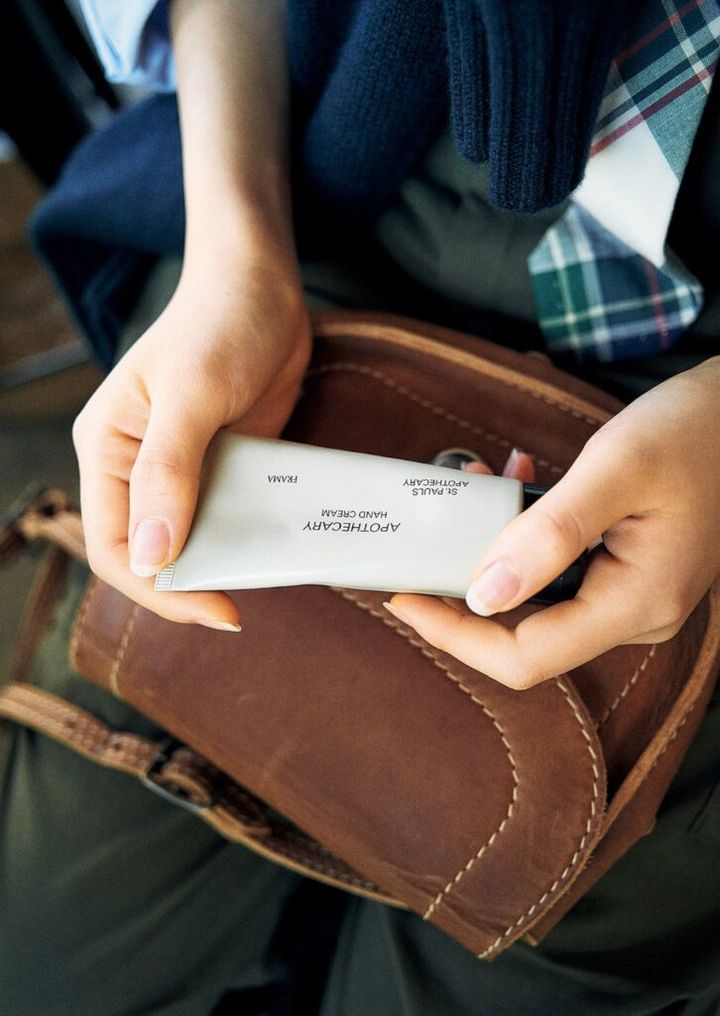 肌の乾燥が気になるこの季節。ちょっとした外出でもケアできるようにしておきたい。コペンハーゲンのデザインスタジオ〈フラマ〉の「APOTHECARY Hand Cream 60ml Tube」は、天然素材を使ったクリームが手に優しく、シダーウッド、サンダルウッド、イランイランの自然な香りは、心にも潤いを与えてくれる。小さいバッグでも持ち運べるサイズが嬉しい。¥5,500(ドワネル03‒3470‒5007) ショルダーバッグ¥237,600(ビズビム03-5468-54 24) シャツはp.9、肩にかけたニットは7、パンツは8で紹介。その他スタイリスト私物