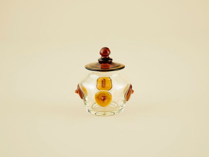 これまでにも何度か登場しているガラス作家、舩木倭帆(ふなきしずほ)さんの作品です。なんともいえないアンバーの装飾が、手にしたときに適度な引っ掛かりとなり、他にはない絶妙な手触り。同じようなサイズの蓋物でも、小鹿田焼など陶器製のものとはまったく別物で、「ガラスの器って良いな」と改めて思わせてくれます。僕は"ボンボン(飴玉)入れ"と呼びたくなるような愛嬌を感じ、飾るだけでは到底満足できず、飴やチョコレートを入れて楽しんでいます。