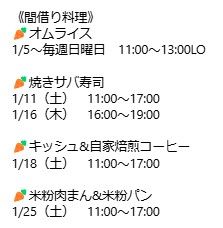 ・平日(月/火/木/金)は手作りの家庭的なお惣菜を販売 ・土日は『間借り料理人』達の個性溢れるお料理をテイクアウト販売 していて、 ・毎週水曜日の16:30〜18:30には《惣菜セット宅配サービス》 ・《ケータリング》は平日ランチタイム、土日祝日のランチ/ディナータイムで予約が可能です。