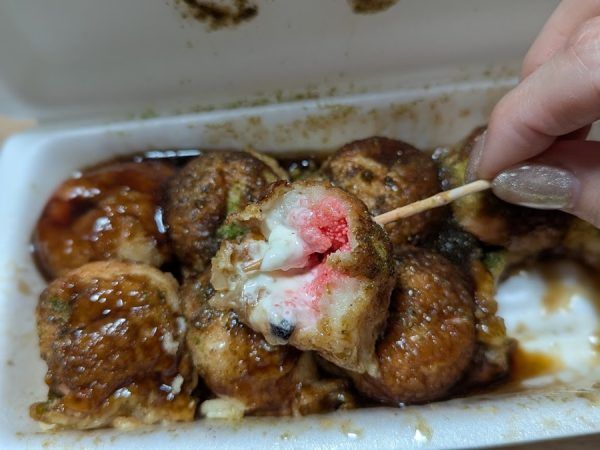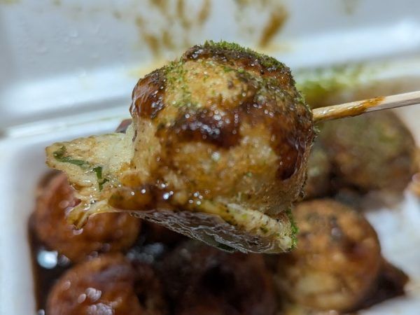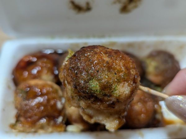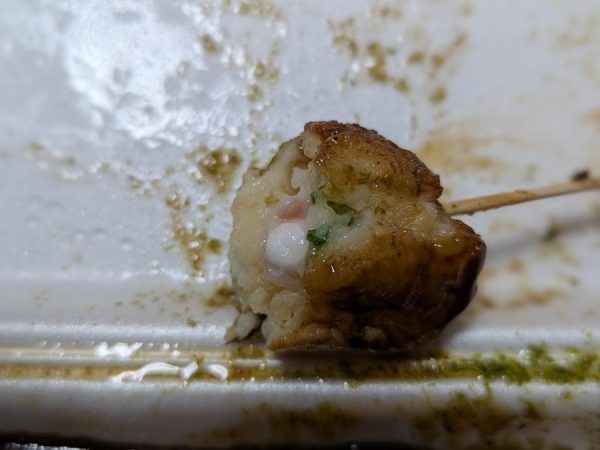 見た目はたこ焼きと一緒。 明太マヨは明太子が混じったマヨネーズがかかっているのかなと予想していたけど違っていたみたい。 さっそくパクリ。