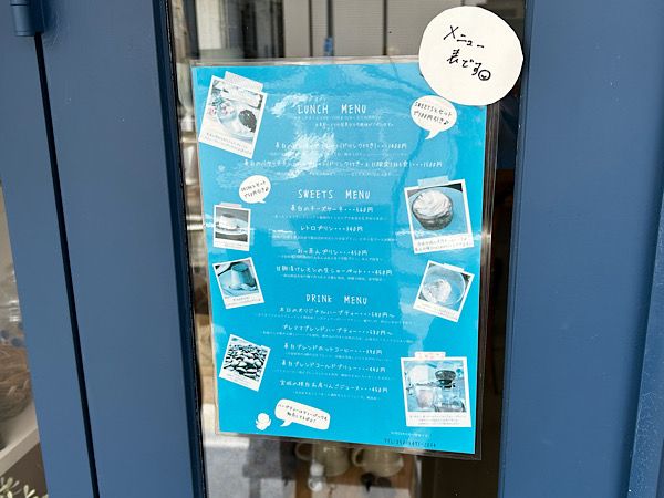 真っ青な壁が目を惹きますね。 入り口にメニューが表示されていて、いろいろなおいしそうなメニューに、お腹が空いてくる〜。