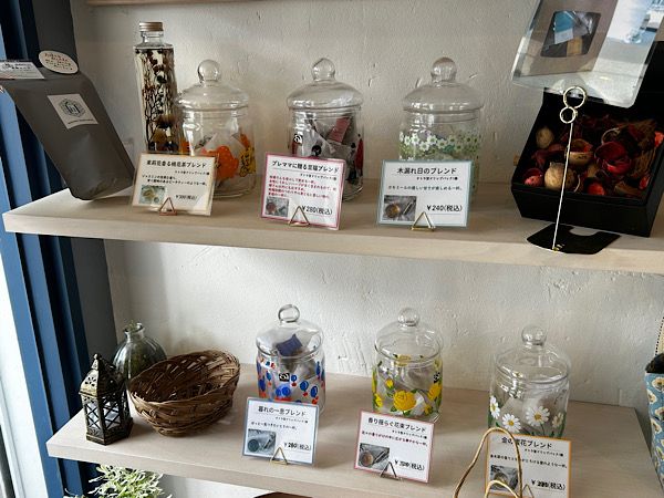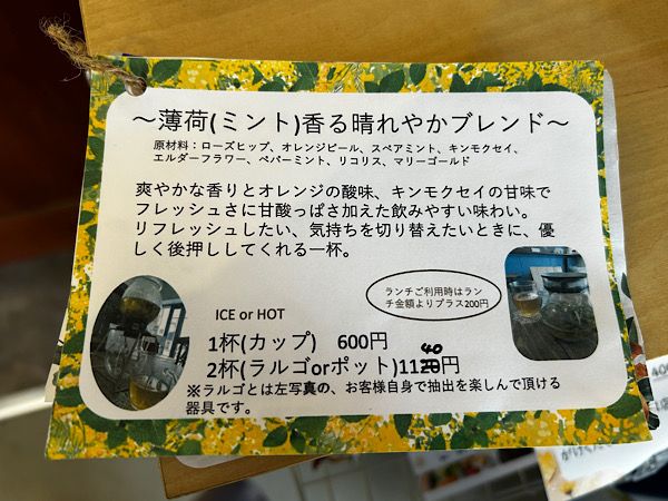 店主さんは、ハーブセラピストの資格を有しているそう。 店内でも、その日の天気や気温に応じてブレンドされるハーブティーが4種類ありましたよ。