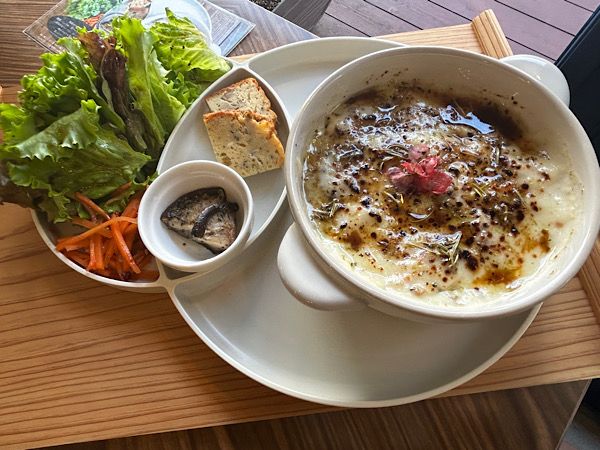 いろんな風味が口の中で調和し、少しずつ身体が温まって美味しい! 副菜に、椎茸のアヒージョ風と椎茸のバター醤油風味の和風ケークサレ、サラダも付いてきます。 アヒージョはガーリック・オリーブ・バジルで味付けされているそう。 椎茸のアヒージョってお酒が進みそうでクセになりそうでした。 ケークサレは、キッシュのような感じで美味しかったです。