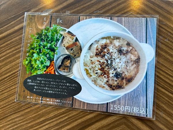 いや〜、限定という言葉に昔から弱い私(笑) こちらのメニュー名は、「秋冬限定 ハーブソース香る炙りチーズのミートドリアプレート」(1,550円)。 ハーブソースのドリアなんて、良い香りがしそうだし、他のお店で見かけたことがなく、なんだか珍しい!