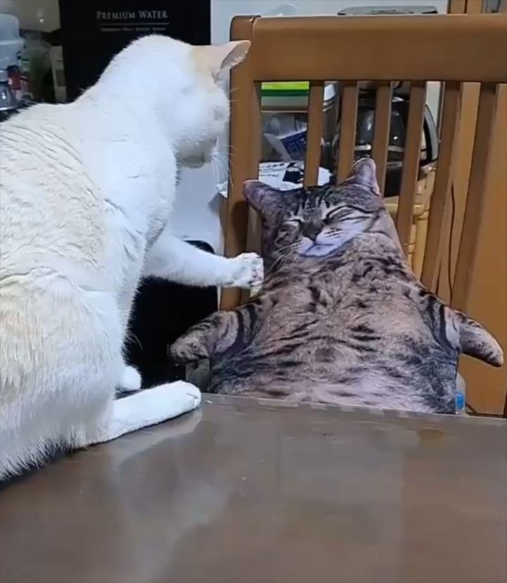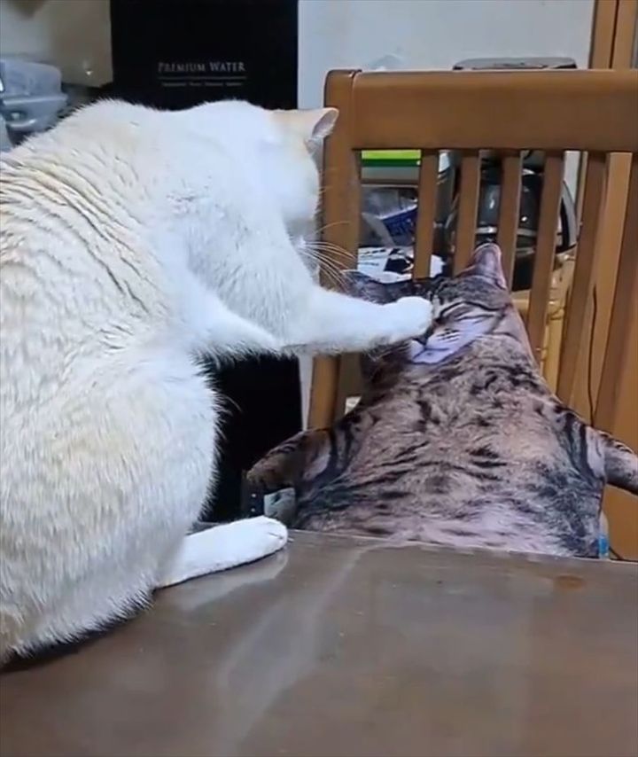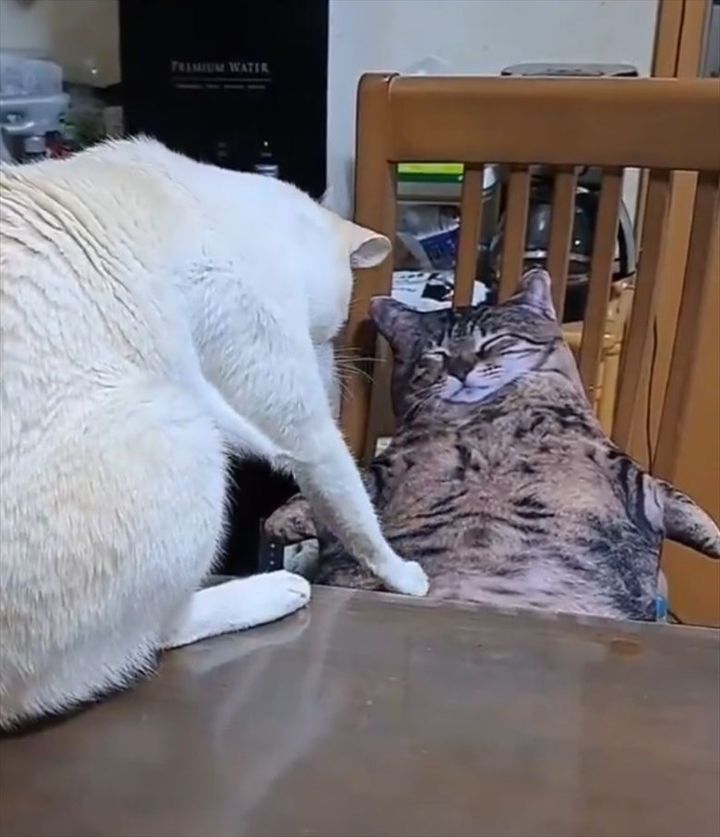 知らないネコが椅子で眠っている?様子をうかがうネコの姿が話題に「やさしく触れるのがかわいい」「こんな子はいたかにゃ?」