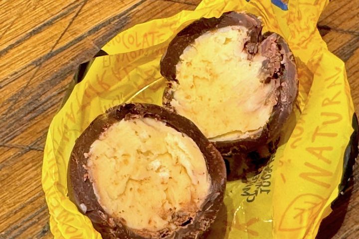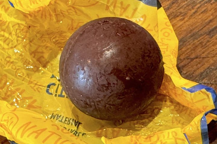 黄色い包み紙を開くと、まん丸のチョコレートが登場します。