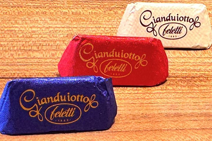 写真はブルーグリーンの包み紙の「ジャンドゥーヤ」。ヘーゼルナッツのペーストを練り込んだチョコレートに、ホールのヘーゼルナッツも入っています。