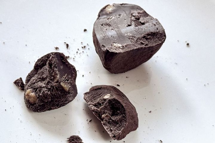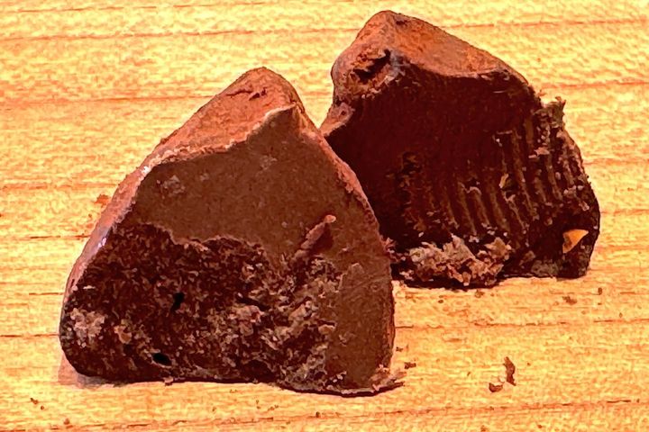 ひと粒口に放り込み、ほろ苦いココアパウダーと口どけまろやかなミルクチョコレートを舌の上で転がしていると、まもなく細かく砕いたポップコーンがあらわれます。キャラメリゼされたようなカリッコリッと心地よい歯触りと、香ばしさが新感覚のトリュフです。