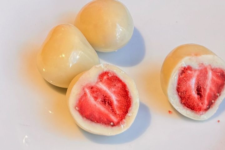 割ってみると、フリーズドライの真っ赤なイチゴがまるまる入っているのがわかります。
