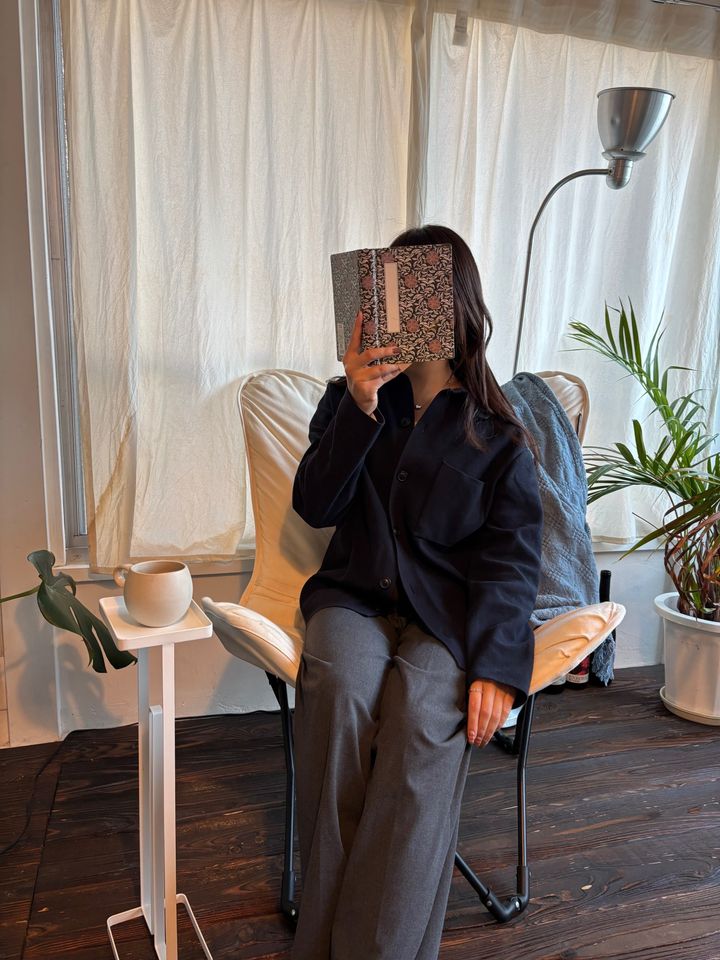 中にインナーを着て、ボタンも上と下を二つずつ外すと、スッキリして見えておすすめです🤍