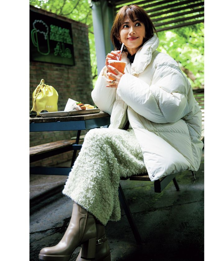 2位 品よく華やか【白ダウンジャケット×ラメニットスカート】でフットワーク軽く