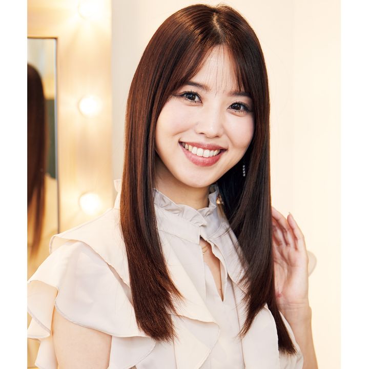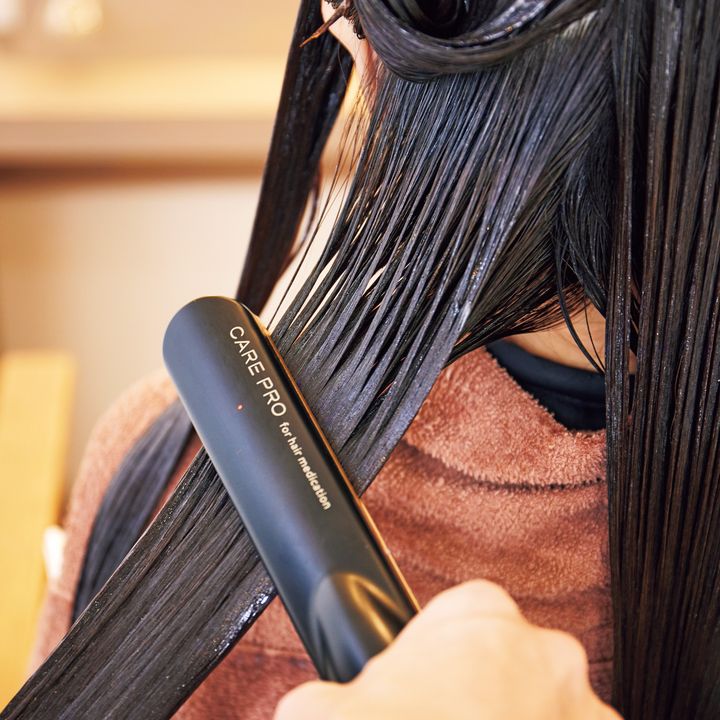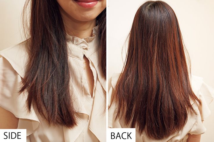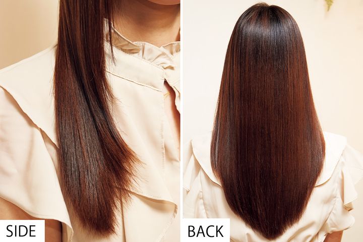 「根元から毛先まで芯が通ったような、ハリのある若々しい髪になりました。ロングの毛先までツヤが出ていることが驚きです!」髪内部に浸透した水素を熱反応で水分にしたことで、毛先までしっとりした質感に。