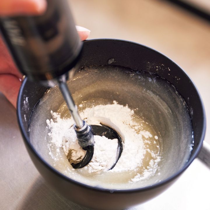 コラーゲン、タンパク質、ヘマチン等が入ったトリートメント剤に、活性酸素を除去してくれる水素パウダーを入れて混ぜます。