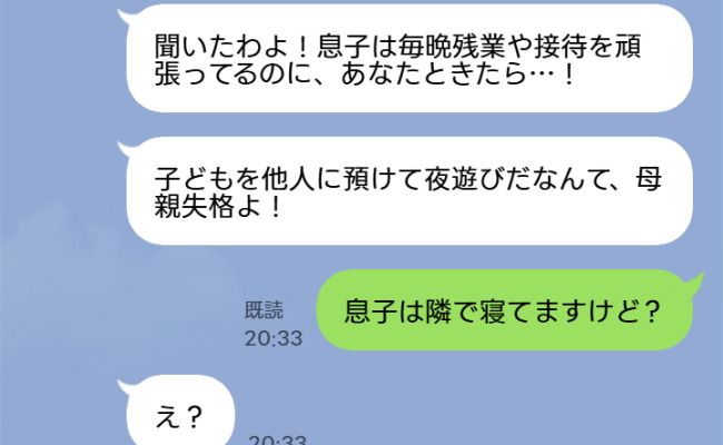 3. 義母「子どもを置いて夜遊びなんて母親失格よ!」私「息子は隣で寝てますが?」真実を知った義母と嘘つき夫の哀れな末路