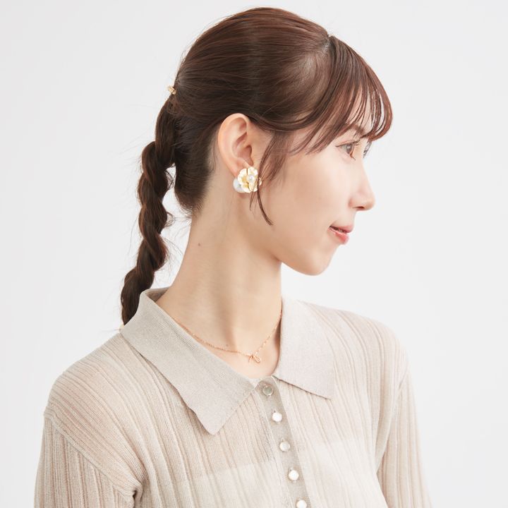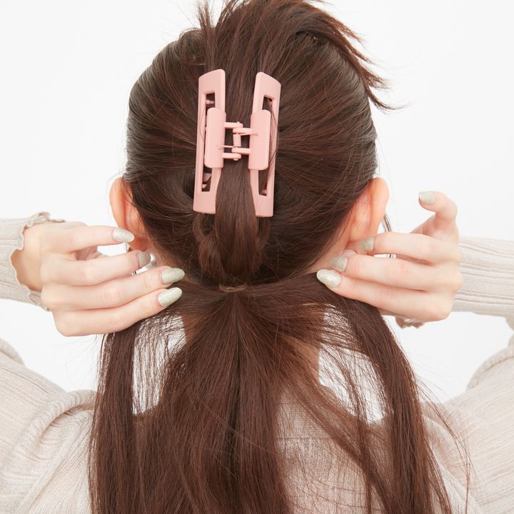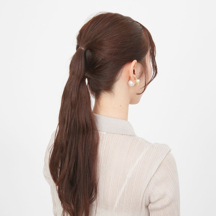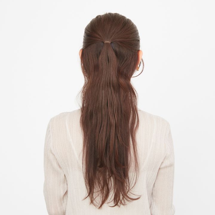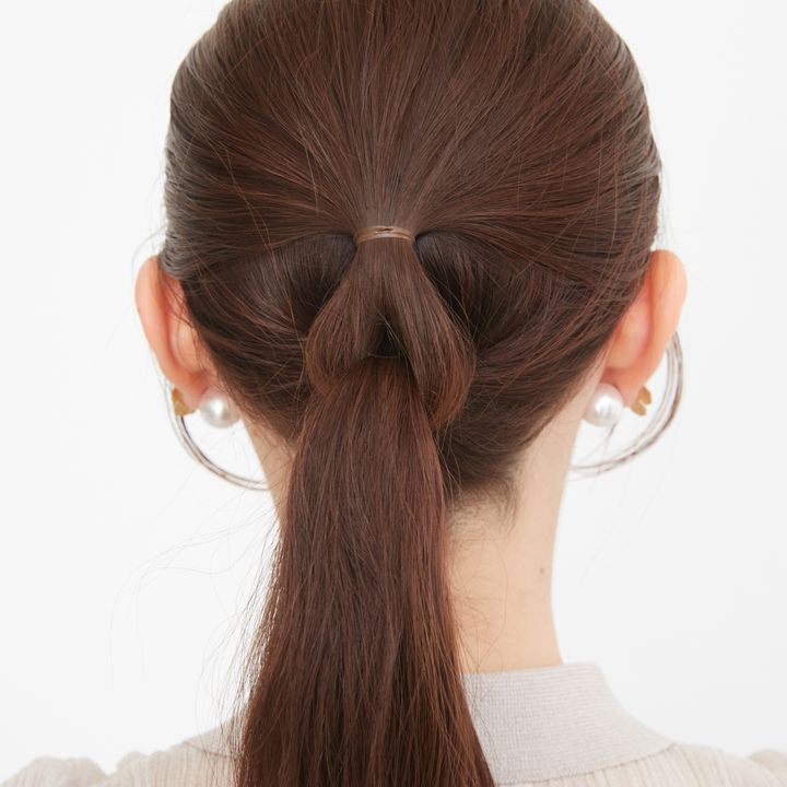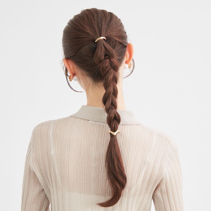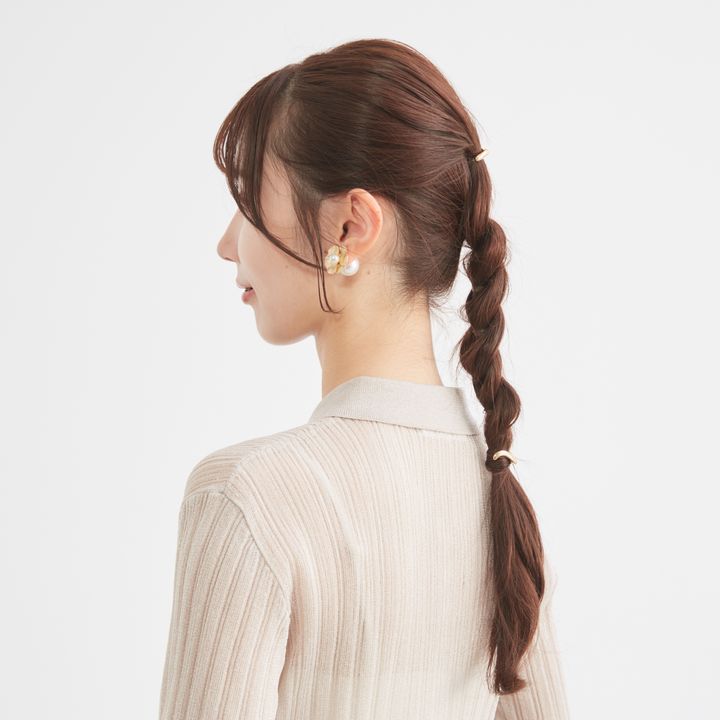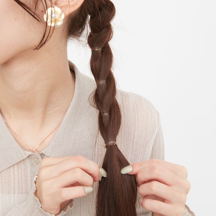 6.毛先近くまで結んだら毛束を鎖骨側に持ってくると作業しやすい。毛先ギリギリまで結ばず、長めに残したほうが手早くでき、こなれた印象に。最後にゴムの結び目をヘアアクセで隠して完成。