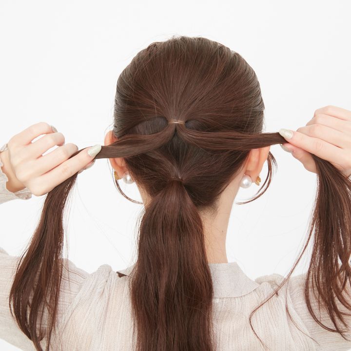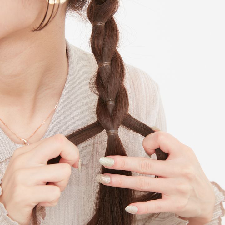 5.結んだ毛束を横に広げるように引き出し、少しくずしておくと、より編み込み風の見た目に。