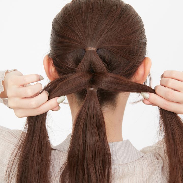 上下の毛束を合わせて編み込み風にするので、上下の結び目の間隔は空けすぎないのが上手に作るコツ。