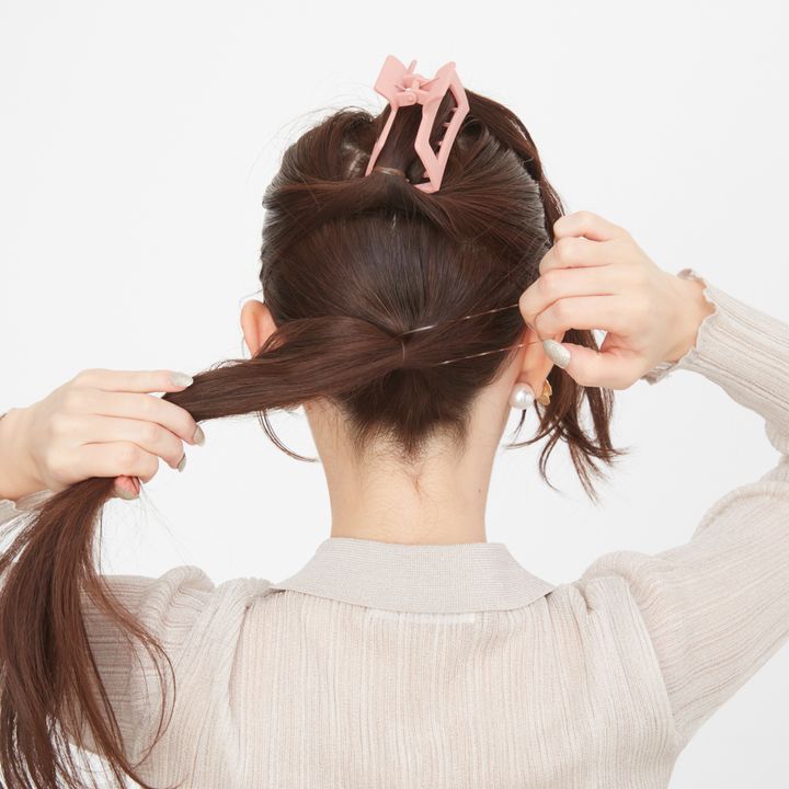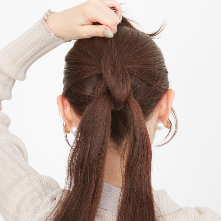 難しいアレンジはできないという人も、ゴムを結ぶだけでできる「編み込み風」のまとめ髪ならトライしやすいはず。下準備は、耳上のラインで髪を上下ふたつに分けてひとつ結びにするだけ。あとはゴムで「編み目」の部分を作れば完成です!