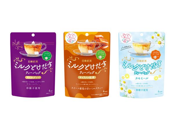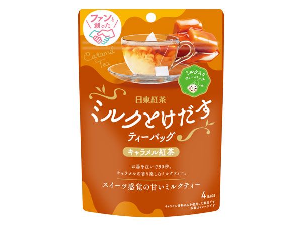 「日東紅茶」のブランドエッセンスである【TEAの「もっと」を創り出そう。】を掲げた“TEAの「もっと」プロジェクト”として「ファンと創った」共創型開発商品。日東紅茶ファンと開発ミーティングを行い、試作と評価を重ねて生まれたフレーバーです。「ミルクとけだすティーバッグ」シリーズの中では最も甘い香味。とろけるようなキャラメル感を楽しめるスイーツ感覚のミルクティーに仕上がっています。