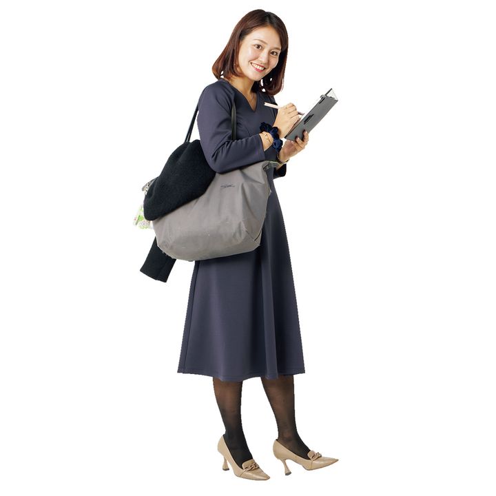 「取材現場ではtoccoのワンピとヒールで上品コーデに。ロンシャンにはPCから資料、待機中に読むKindleまで荷物がギッシリ」