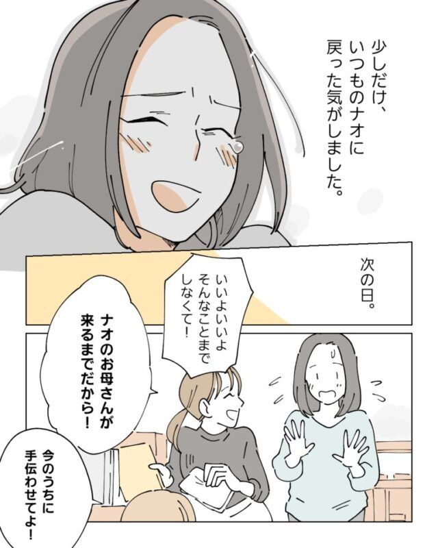私たちに背中を押されたナオが実家に連絡すると、お母さんが次の日から来てくれることになりました。