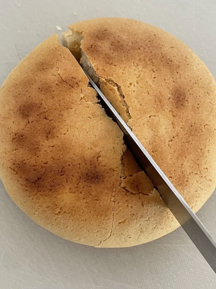 サクサク感をより味わいたかったので、レンジでチン→オーブンで軽く焼いてみました! 見るからに食感がよさそうなパンを半分に切ってみると……サクサクというより、ザックザクでクリスピー!