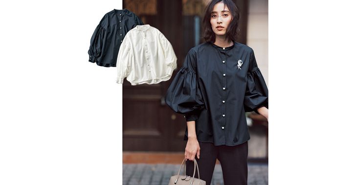 フロントのパールボタン、ボリュームのあるバルーン袖が目を引く一枚。袖をたくし上げやすいよう袖カフスの内側にゴム入り。