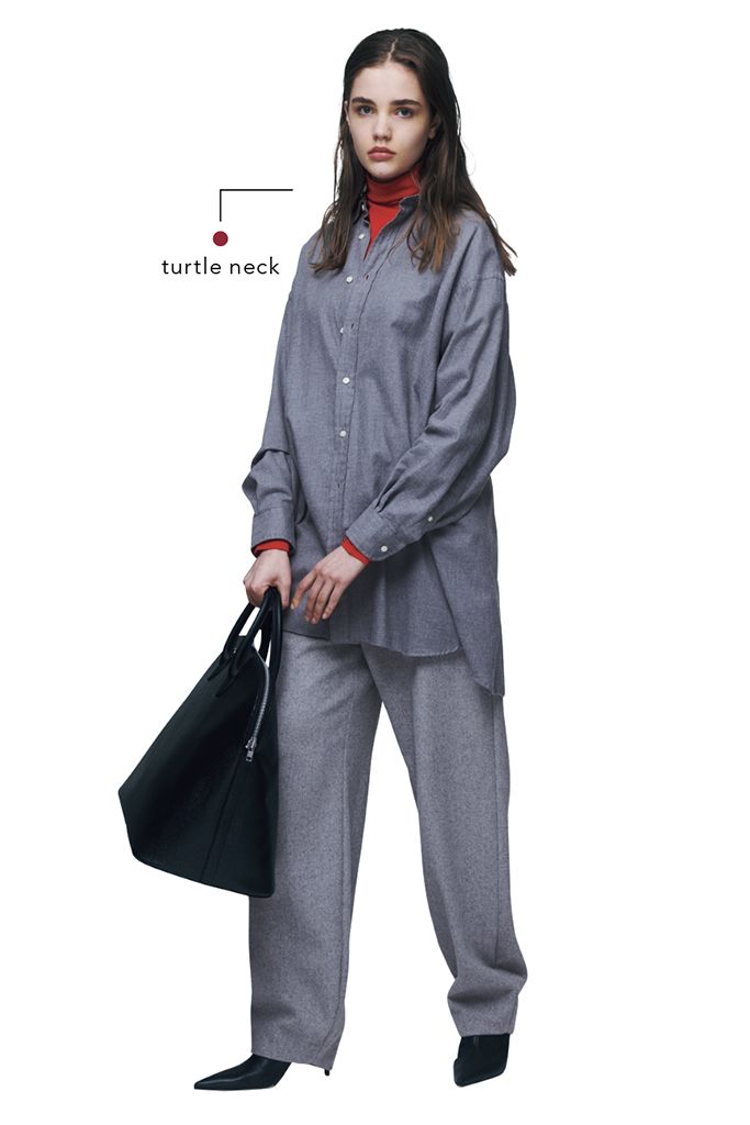 中に着た赤ハイネックウールニットトップス/バナナ・リパブリック グレー別注シャツ/INDIVIDUALIZED SHIRTS(サロン アダム エ ロペ) グレーウールパンツ/ENFÖLD 黒ビッグボストンバッグ/ザ・パース(プレインピープル青山) 黒ハーフブーツ/PIPPICHIC(ベイジュ)