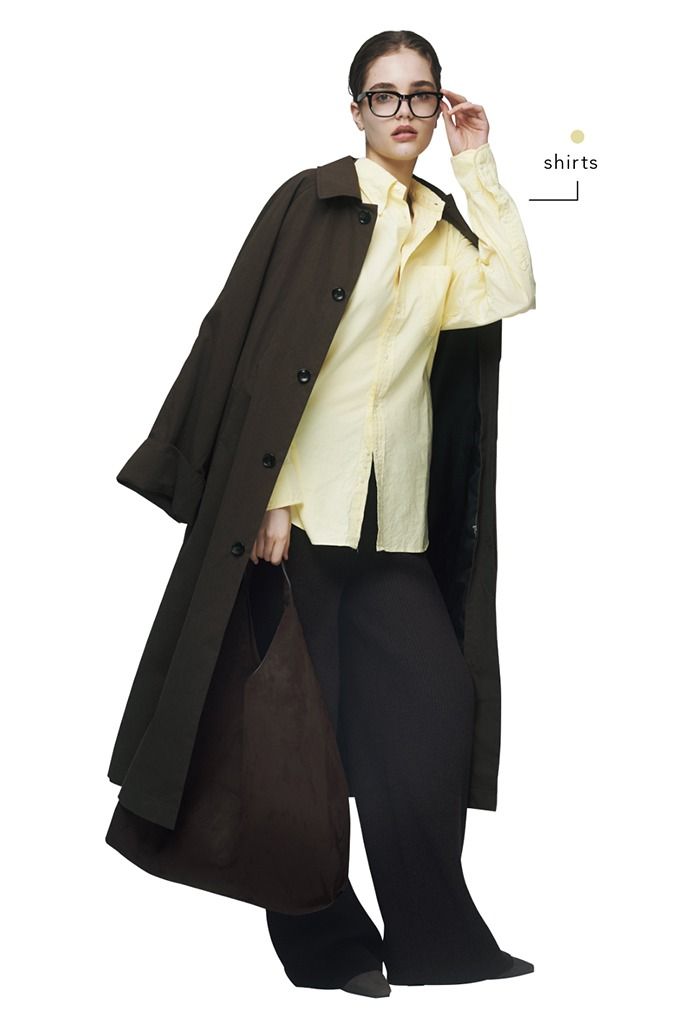 オフ白にほど近いさわやかなイエローのコットンシャツ。パリッとした白では出しにくいやさしさが生まれ、策を弄さずとも単調さのない見た目に。イエローをさらに延長させ、合わせた服や小物をブラウンで統一しシックにまとめて。