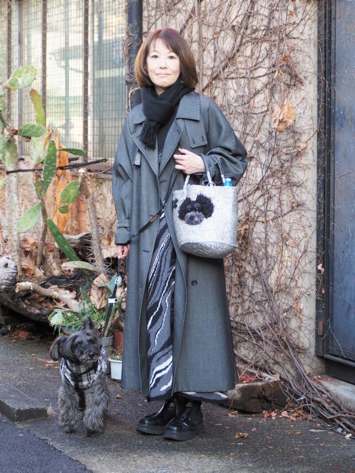 愛犬とのお散歩で代官山近辺を歩いていたYUKOさん。一枚でさまになるニットワンピースに、光沢のある「アメリ ヴィンテージ」のコートをさらっと重ね、上品な都会派コーディネートに仕上げています。「今日は黒とグレーのグラデーションでシックにまとめてみました」