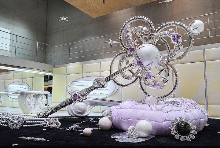 各スペースでは、華やかな装飾が際立つアイウェアと巨大なマジカルステッキ、散りばめられた宝石のオブジェが融合した、ジュエリーとアイウェアの境界を超える新しい世界を楽しめる。