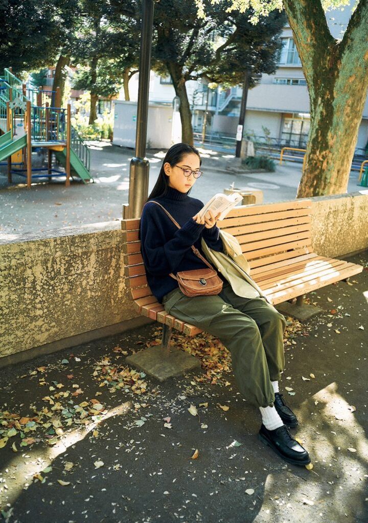 冬の澄んだ空気が気持ちいい晴れた日、近くの公園まで散歩しようと袖を通したのは、カシミアを使った日常着を提案する〈キャッシュアンドバルバ〉のニット。タートルネックが北風からも優しく首元を守り、上質なベビーカシミアを100%使用した生地は滑らかな肌触り。ゆったりとした身幅と長めの袖感がモダンなシルエットをつくり、歩くたびにドレープが豊かな表情を見せる。¥68,200(エグジステンス https://cashbarba.com) メガネはp.9、バッグは6、パンツは8で紹介。その他スタイリスト私物
