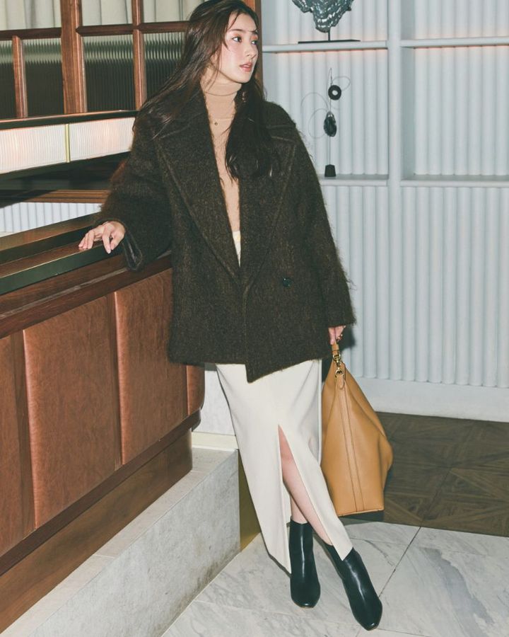 1月16日(木)、マニッシュな印象のオーバーコートを着る日は、すっきりとしたIラインシルエットを意識してバランス調整を。光沢の効いたスリットスカートに頼れば、ドレッシーなムードが加わり女っぽく昇華できます。膨張して見えがちな白でも、肌見せ効果でグッとシャープに。仕上げにレザー小物でキリッと引き締めて。