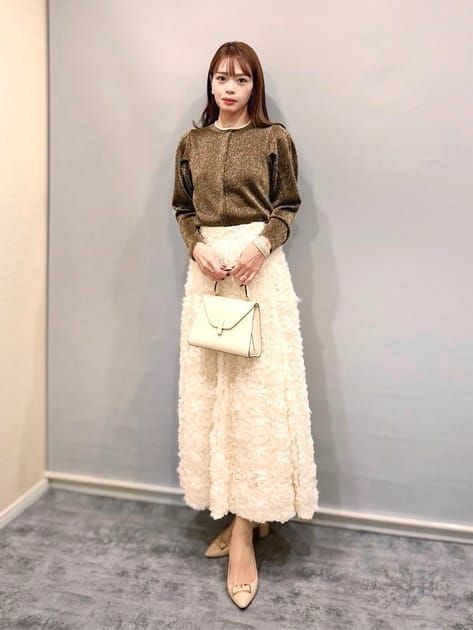 上品なラメニットとフリンジの効いた甘スカートの組み合わせも、上質ブラウンカラーで大人の落ち着きを演出。カーディガンは袖の構築的なデザインが印象的なアイテム。重くなりがちな冬コーデに程よい華やかさをプラスしてくれます。