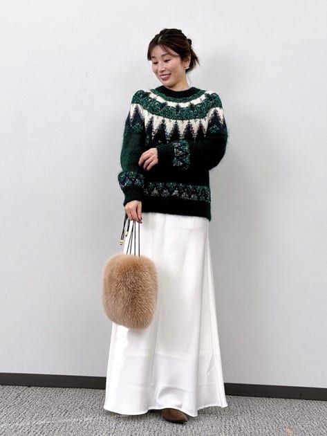 2.「カジュアルセーター×サテンスカート」でキレイめデイリーコーデ