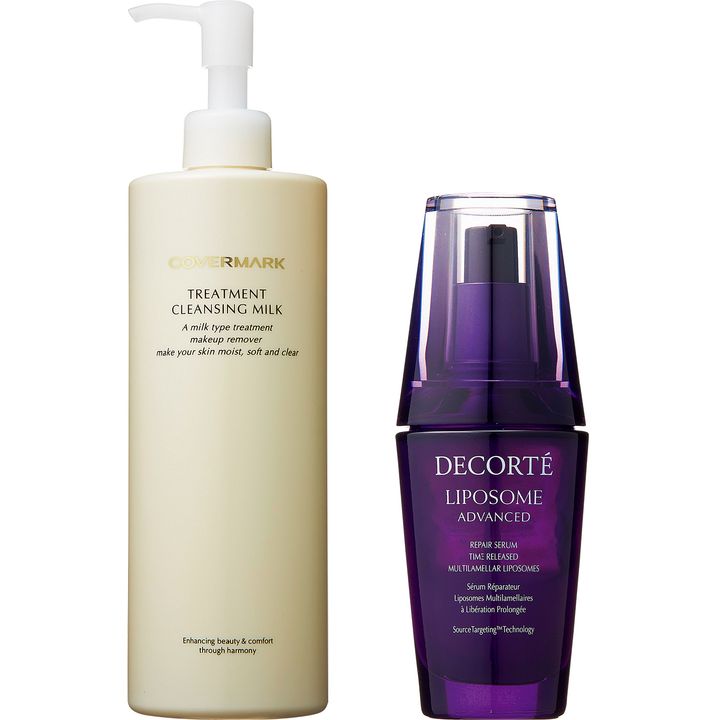 カバーマークのクレンジングミルクで、薬指を使って、摩擦レスメイク落とし。さらに、お風呂の中でコスメデコルテのリポソームを肌に馴染ませます。