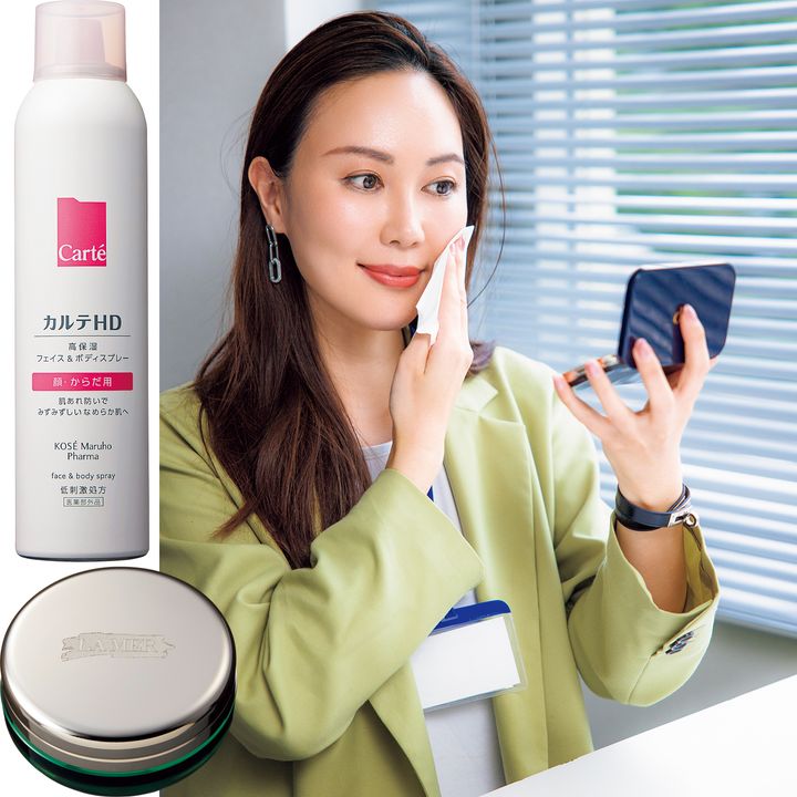 化粧崩れや余分な皮脂をティッシュオフ後、カルテHDのスプレー&ラ・メールのリップバームでしっかり保湿します。