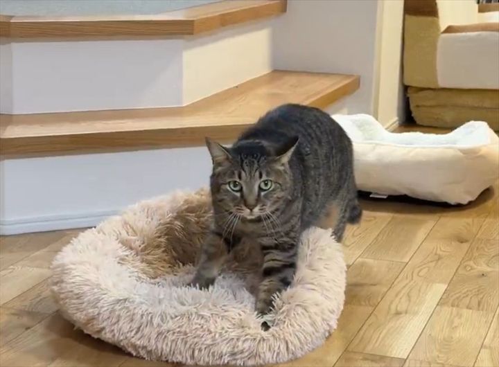 モフモフのベッドをこねこねし、少しずつ迫ってきているトラちゃん。
