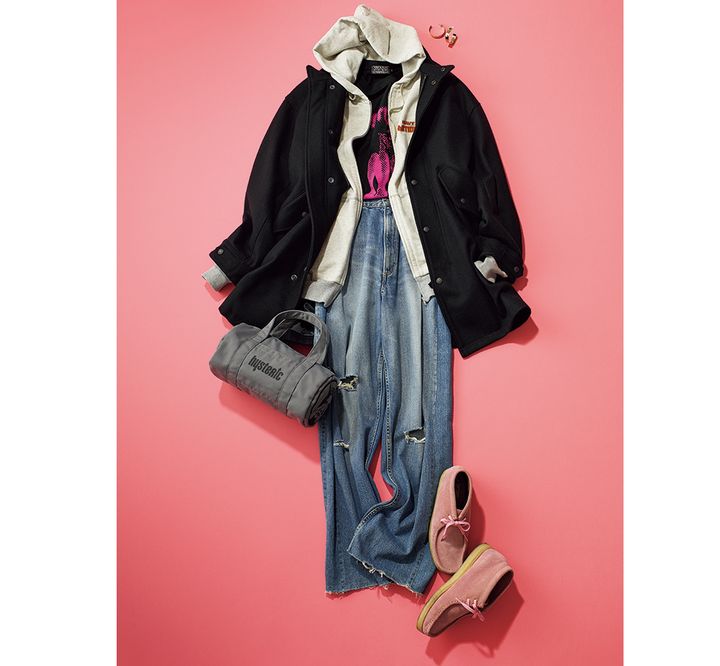 コート¥88,000パーカ¥36,300Tシャツ¥11,000デニムパンツ¥39,600バッグ¥19,800シューズ¥44,000(すべてヒステリックグラマー)ピアス¥21,780(ソコ/ZUTTOHOLIC)