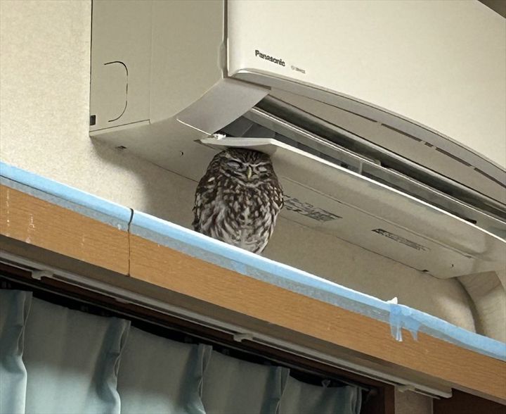 エアコンの下というわずかなスペースにいたフクロウ。 ちまっと収まるその姿がかわいすぎると話題になっています!