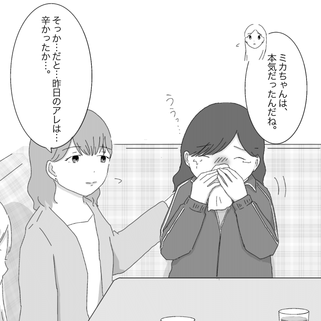 ぐずぐずと泣き続けているミカに、「ミカちゃんは本気だったんだね」カナコがそう言うと、「そっか・・だと・・昨日のアレは・・辛かったか・・」ミカの背中をやさしく撫でながらモカが言いました。