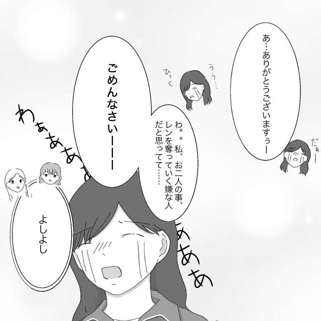「あ・・ありがとうございますぅー」そう言いながら泣きじゃくるミカは、「わ・・私、お二人の事、レンを奪っていく嫌な人だと思ってて・・ごめんなさいーー!!」泣きながら謝るミカに「よしよし」と2人は呟きました。