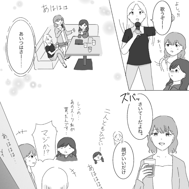そして、「よしっ!!歌うぞー!」とカラオケで嫌な気持ちを吹き飛ばすことに。「あいつはさー・・さいてーだよね」「頭がいいだけ」「あ、レンの・・あのスーツ、私が買ったんです・・」「マジか!?」3人でレンのことを好き放題言い合い、カラオケを楽しんだのでした。