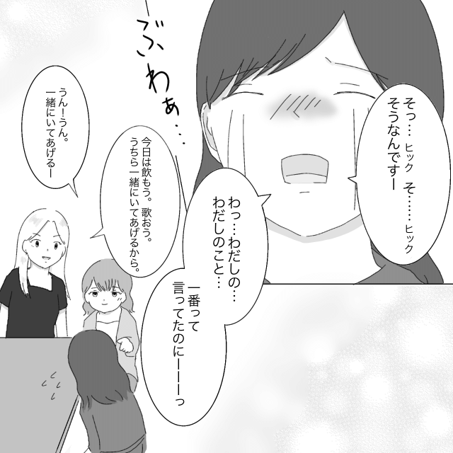 「本気だとしたら、昨日のアレは辛かったか・・」モカにそう言われ、「そっ・・そう・・ヒック・・そうなんですー」またしても大泣きするミカ、「わっ・・わたしの・・こと・・一番だって言ってたのにーっ!」自身の心の内をすべてさらけ出しました。ミカの言葉を聞いたカナコとモカは、「今日は飲もう。歌おう。うちら一緒にいてあげるから」「うん!うん。一緒にいてあげる!」とミカに言いました。