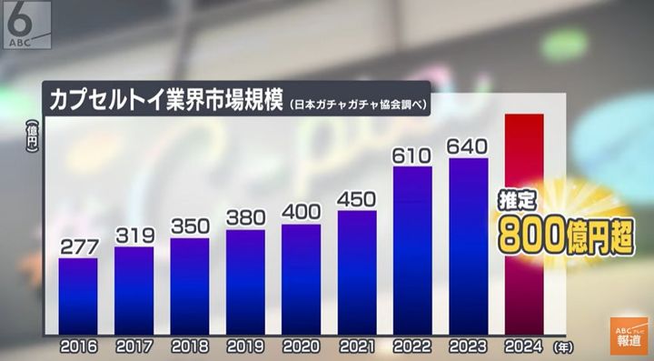 カプセルトイ業界の市場規模は年々右肩上がりに増大。2024年は前年の640億円からさらに伸び、800億円を超えると言われています。市場を担うのは、アイテムの企画や製造を行う「メーカー」、アイテムを仕入れてマシンの置き場を交渉する「オペレーター」、マシンを置いて販売する「販売店」の3つです。