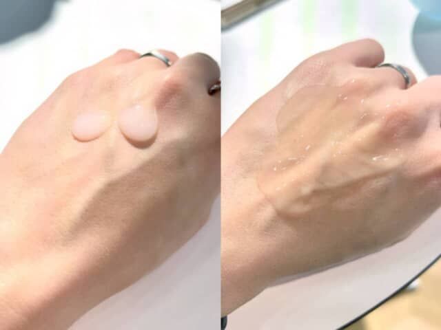 ▲テクスチャーは、とろみ感のあるウォーターベースですが、伸び広げるとベタつかずに、ピンとしたハリ感を実感