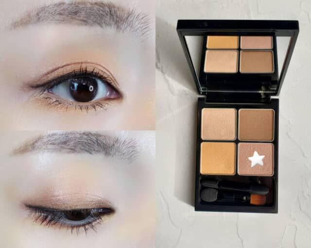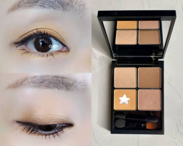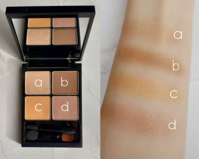 下の2色(c、d)がメインカラーになっているので、ゴールドとピンクをそれぞれメインにメイク。粉っぽくなく肌に密着する質感なので誰でも簡単にきれいに仕上げることができます。